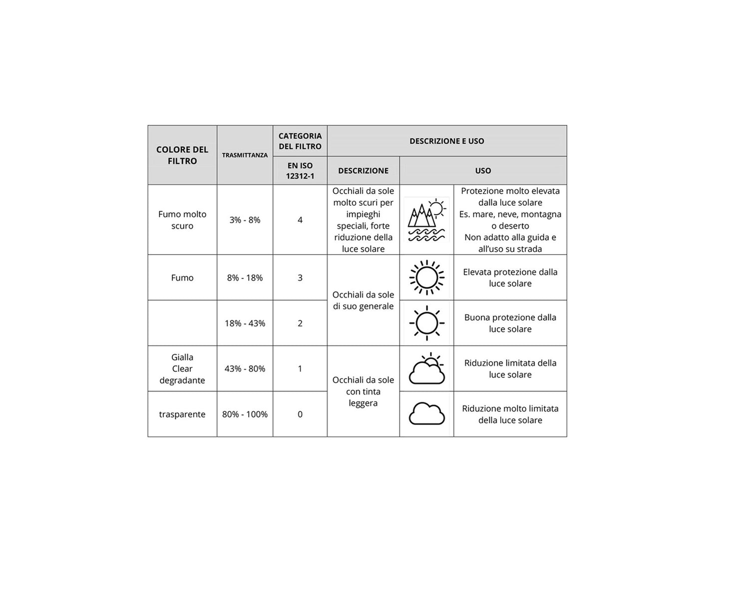 Le lenti, montano filtri solari di primissima qualità e si suddividono in 3 categorie di protezione UV400 (*vedi tabella transmittanza EN ISO12312-1)
